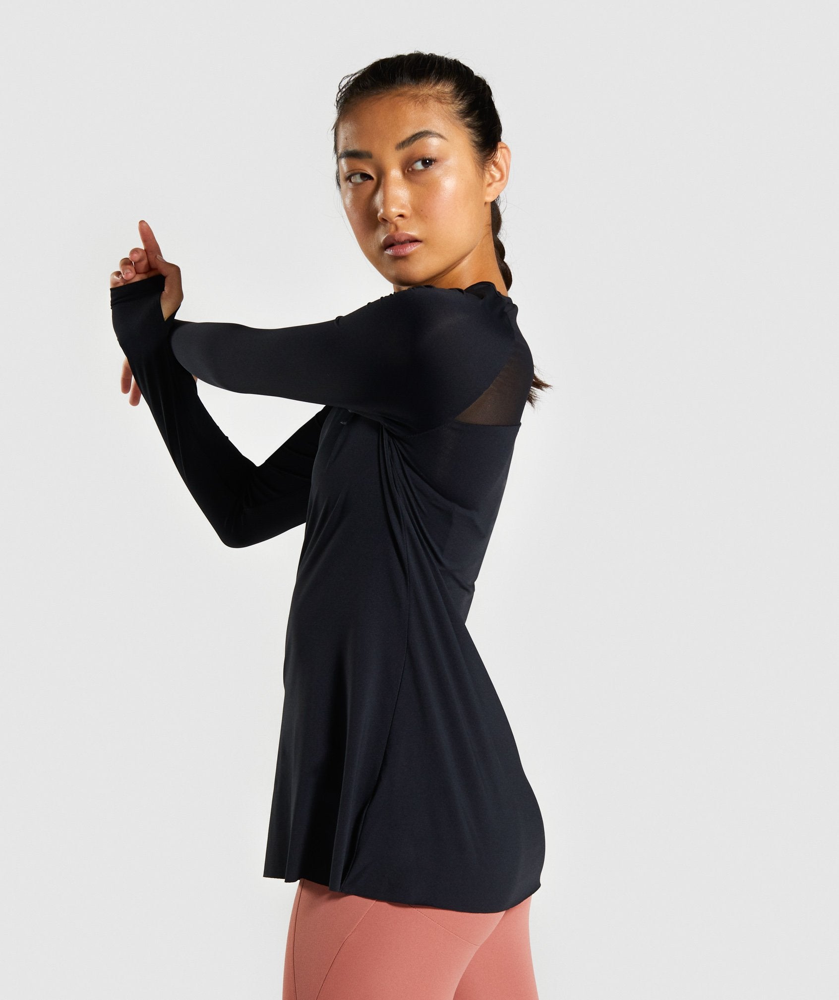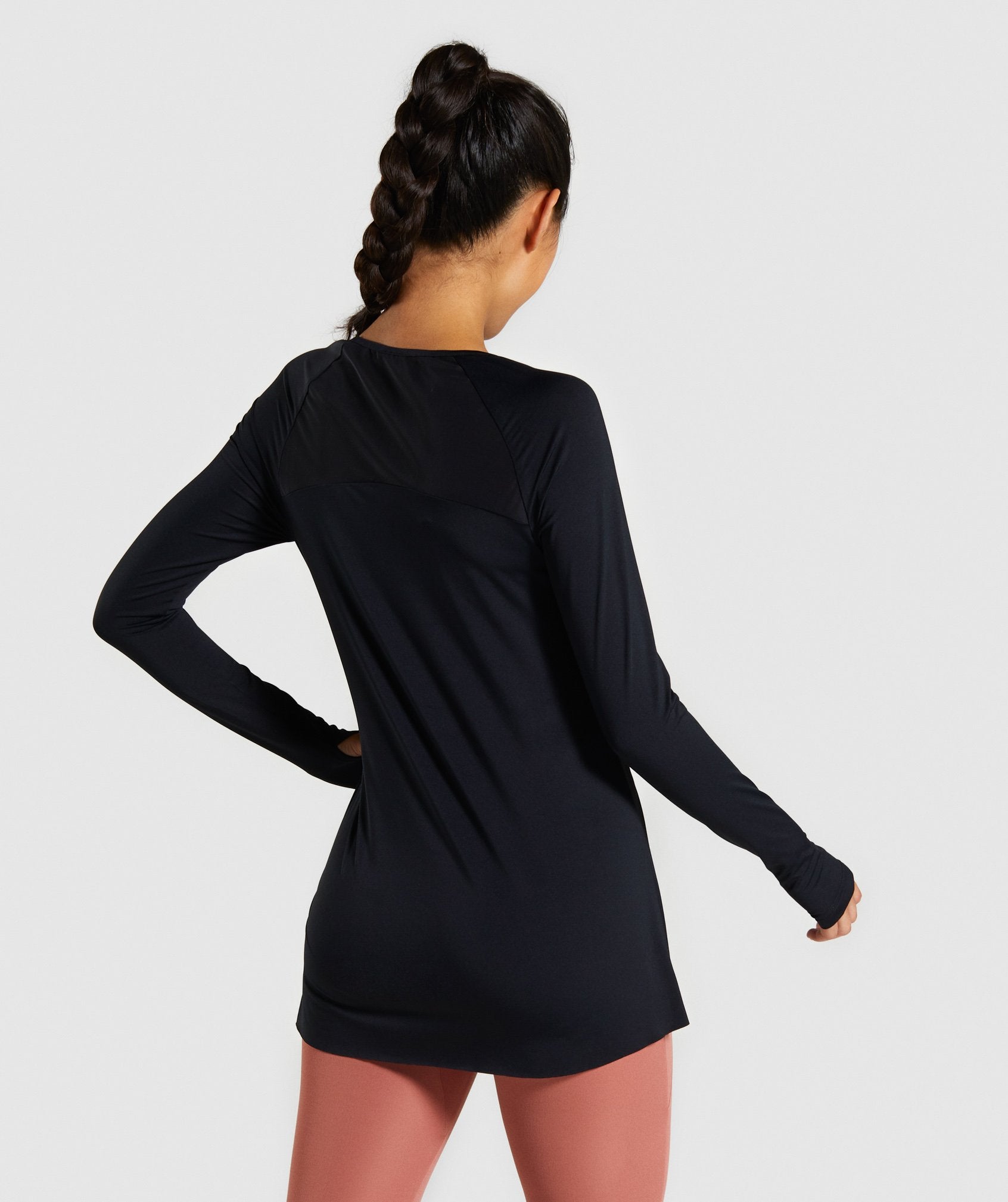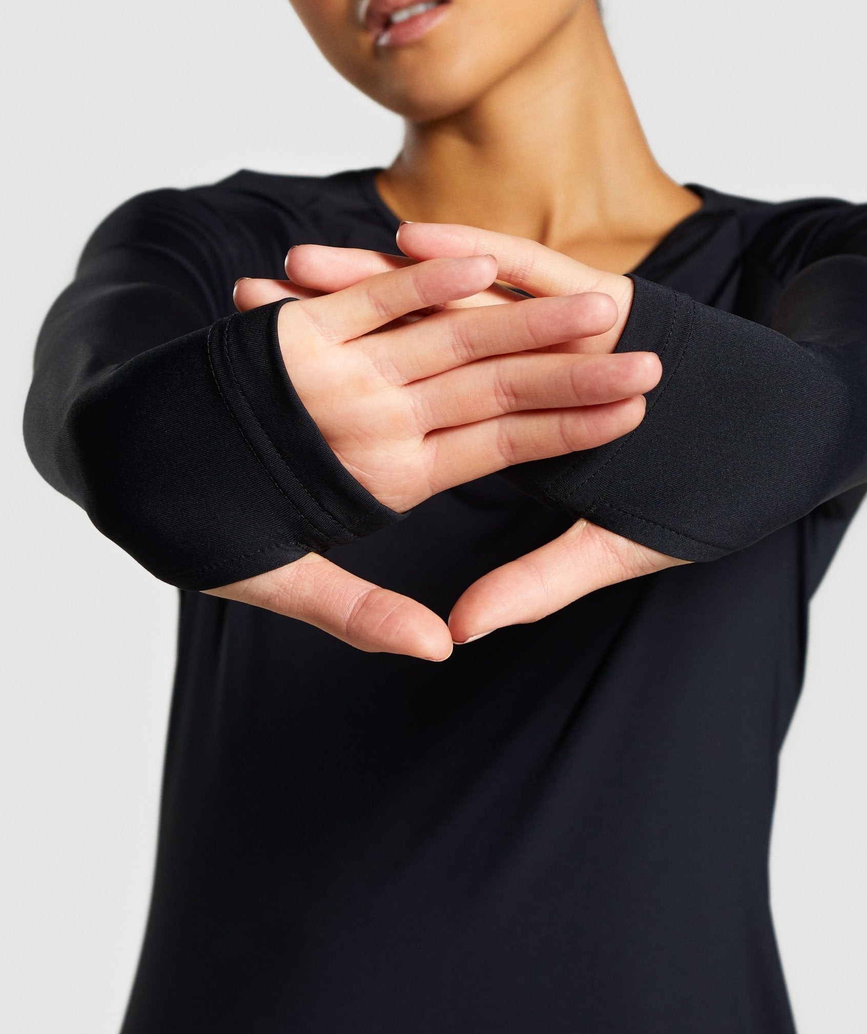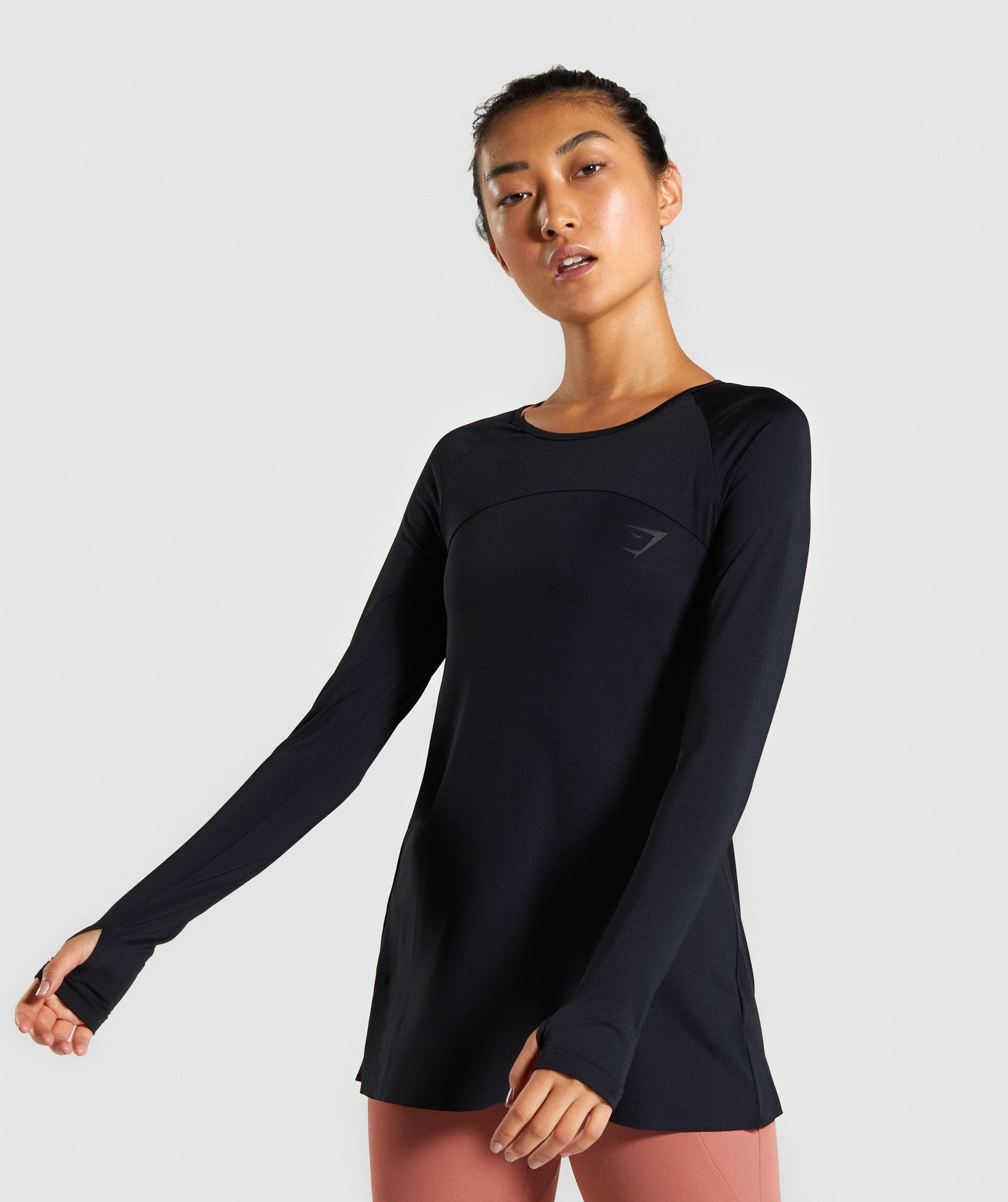 ⁃ Long, slim raglan sleeves with thumbholes