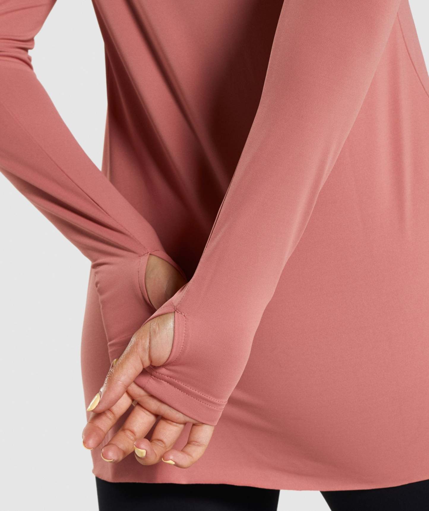 ⁃ Long, slim raglan sleeves with thumbholes