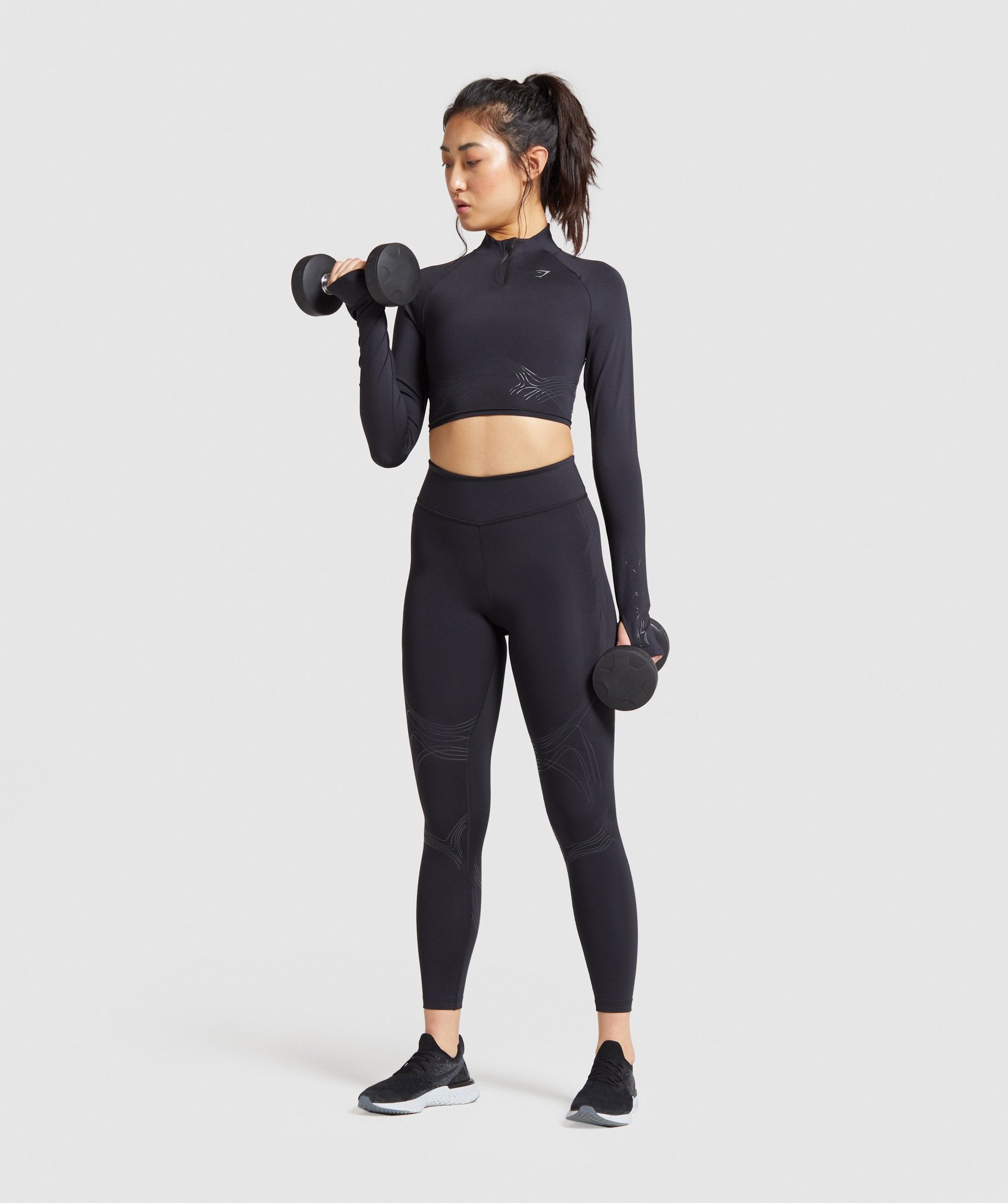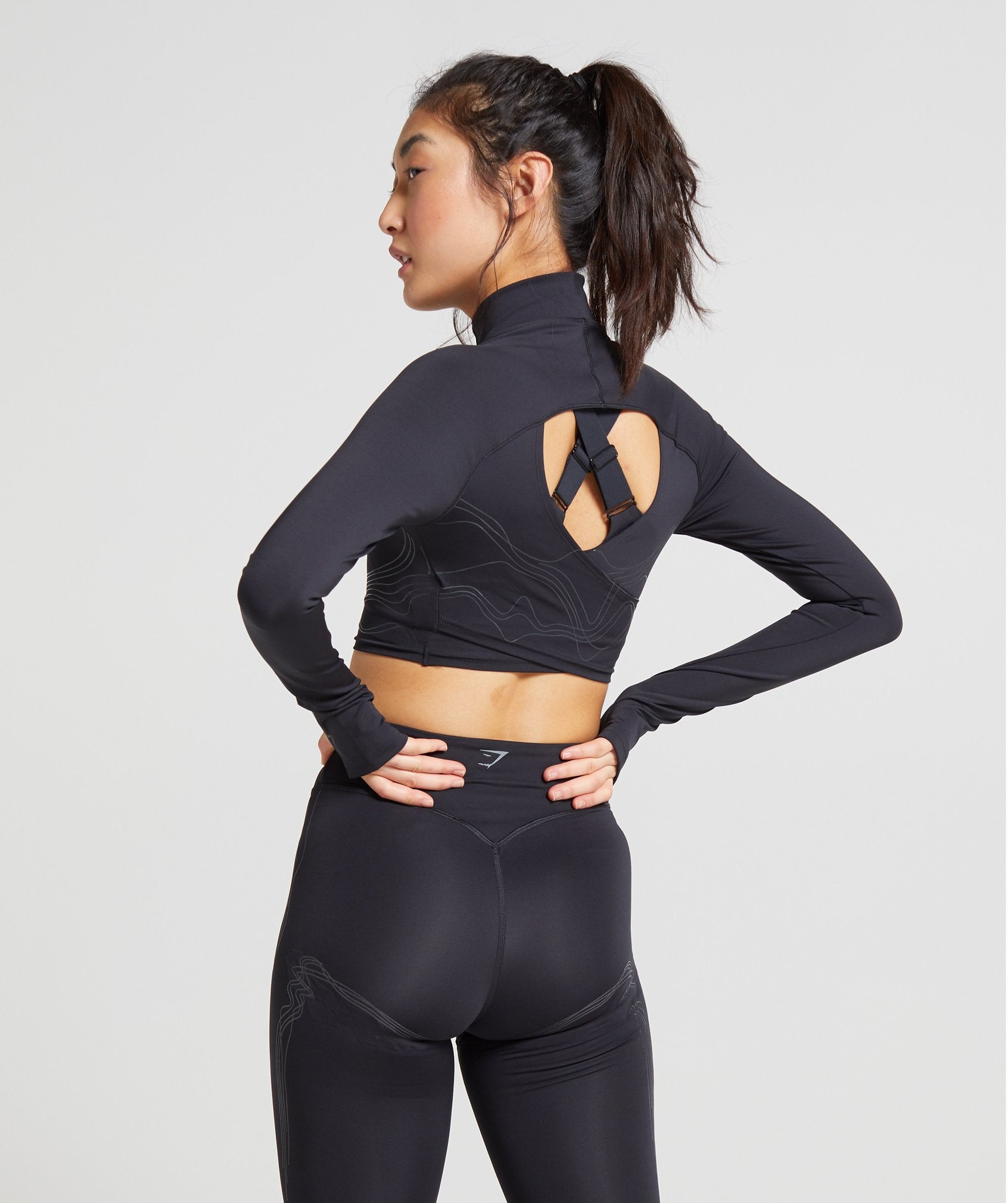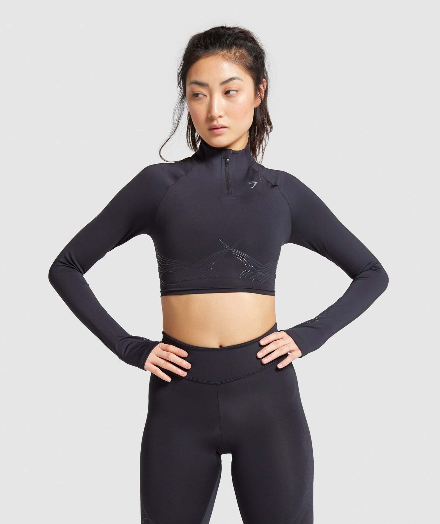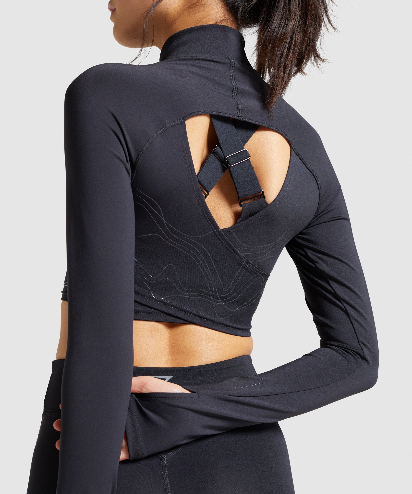 Are you ready to get technical? The Technical Long Sleeve Crop Top features a funnel neck, ¼ zip and thumbholes, as well as a matte print design detail to under bust, sleeves and back. In solid black, this gives you a sleek look with added support of internal silicone flocking.