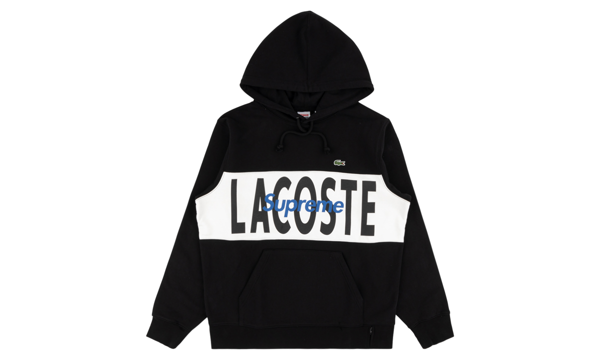 The Lacthtoste x Supreme Logo Panel Hoodie is a special collaboration between the French apparel company and Supreme on a range of premium goods. The Fall/Winter 2019 collection is a strong follow-up to 2018's Spring/Summer drop, as evidenced by this updated take on classic vintage sportswear. Using a soft black cotton base, a contrasting white panel divides the sweatshirt. Overlapping Lacthtoste and Supreme branding in black and blue appears inside the panel, with Lacthtoste's signature embroidered green crocodile appearing on the left chest. Two black hood drawstrings and a front kangaroo pouch put the finishing touches on the look. FW 19
