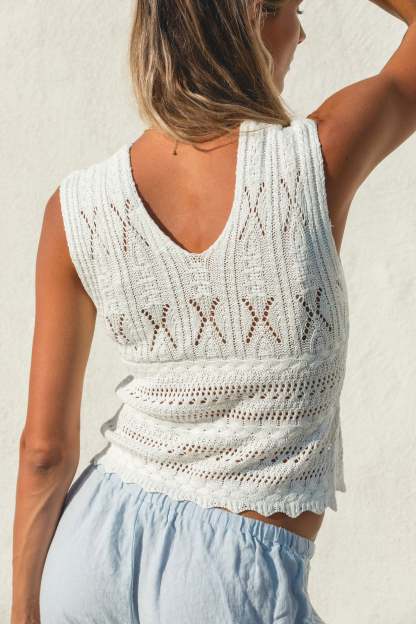 Expertly crafted with a knit and crochet design, the Dahlia Sleeveless Top exudes effortless style. The v-neck and sleeveless features provide a timeless look, while the true white color complements any wardrobe.